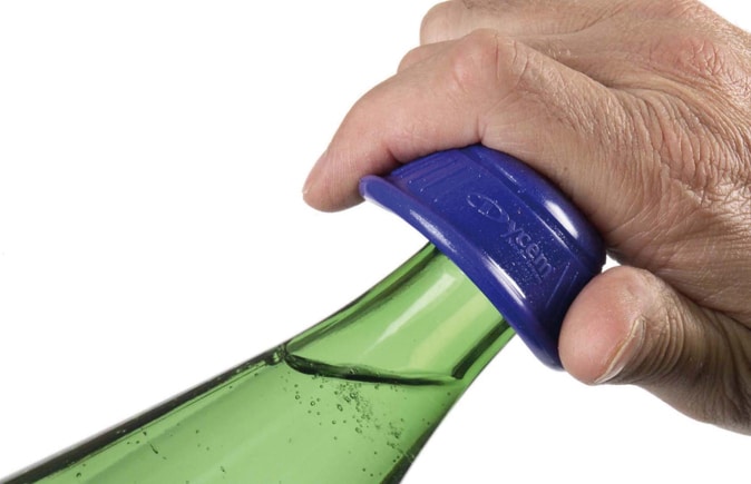 Utensílio que permite abrir garrafas com segurança. Indicado para pessoas com debilidade nos membros superiores ou artrite.