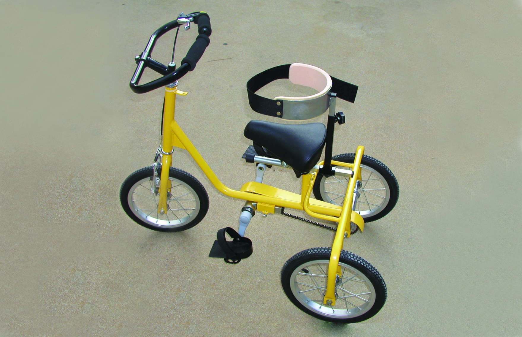 Triciclo adaptado com com suportes de tronco, pedais de tamanho grande, apoios tipo sandália ajustáveis por velcro e sistema de bloqueio à tração. Ideal para mobilização dos membros inferiores a partir de uma posição sentada.